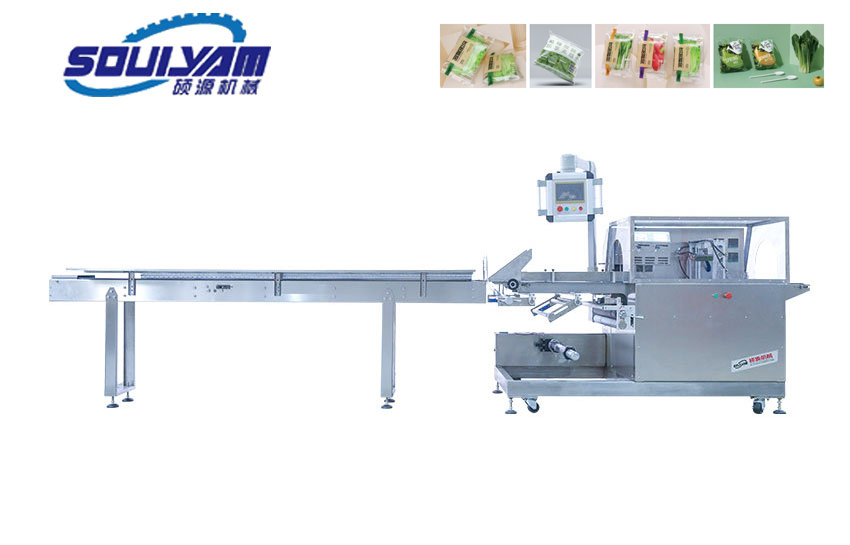 操作流程:人工在工作臺把蔬菜放入輸入輸送機(jī)-》葉菜包裝機(jī)完成自動打孔-》自動裹膜è廢料收集-》制袋成型-》橫封封切-》成品輸出-》進(jìn)入旋轉(zhuǎn)接料盤